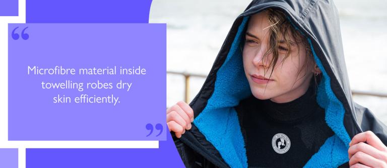 Inside a towelling changing robe, the soft microfibre lining can efficiently wick away moisture from skin without becoming saturated. In addition, the large hood keeps the head warm and protected from wind, and exposed hands can be thrust into the pocket pouch once changing is complete.